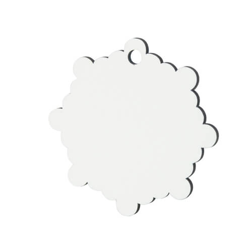 MDF karácsonyfadísz (hópehely) szublimációs nyomtatáshoz. A nyomtatható oldal fehér, a hátoldal barna.