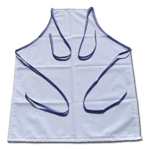 Fehér prémium konyhai kötény kék kockás varrással, szublimációs nyomtatáshoz.