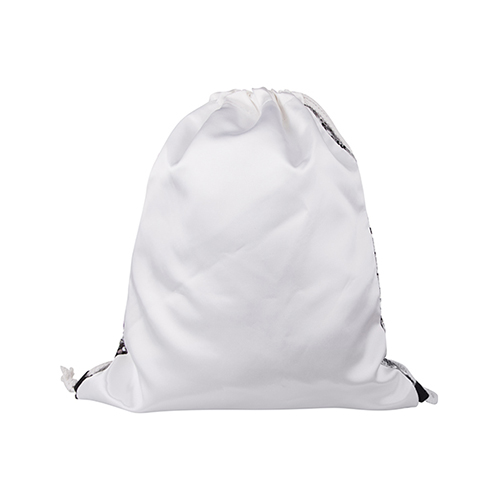 Szublimálható hátizsák. Az egyik oldala fehér poliészterből készül, a másik oldala kétszínű flitterrel készül. A táska minkét oldala nyomtatható. A zsákba zsinór van fűzve.