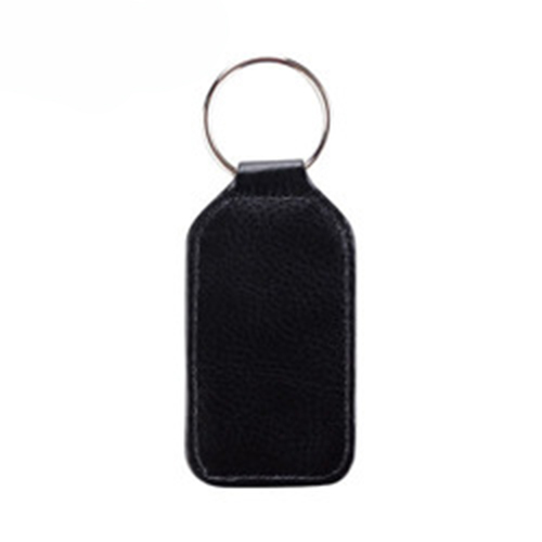 Bőr kulcstartó szublimációs nyomtatáshoz. A nyomtatható oldal fehér, a másik fekete. A kulcstartó fém, krómozott kulcstartóval rendelkezik.