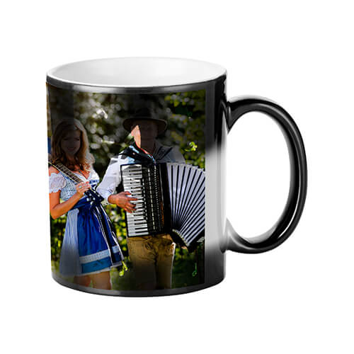 A+ osztályú, poliészter borítású fekete kerámia bögre szublimáláshoz, préseléshez. A+ besorolású kerámia varázsbögre poliészter bevonattal, szublimációs technológiával való nyomtatáshoz. Hangjegyes gravírozással. Hő hatására fedi fel a nyomtatott mintát.